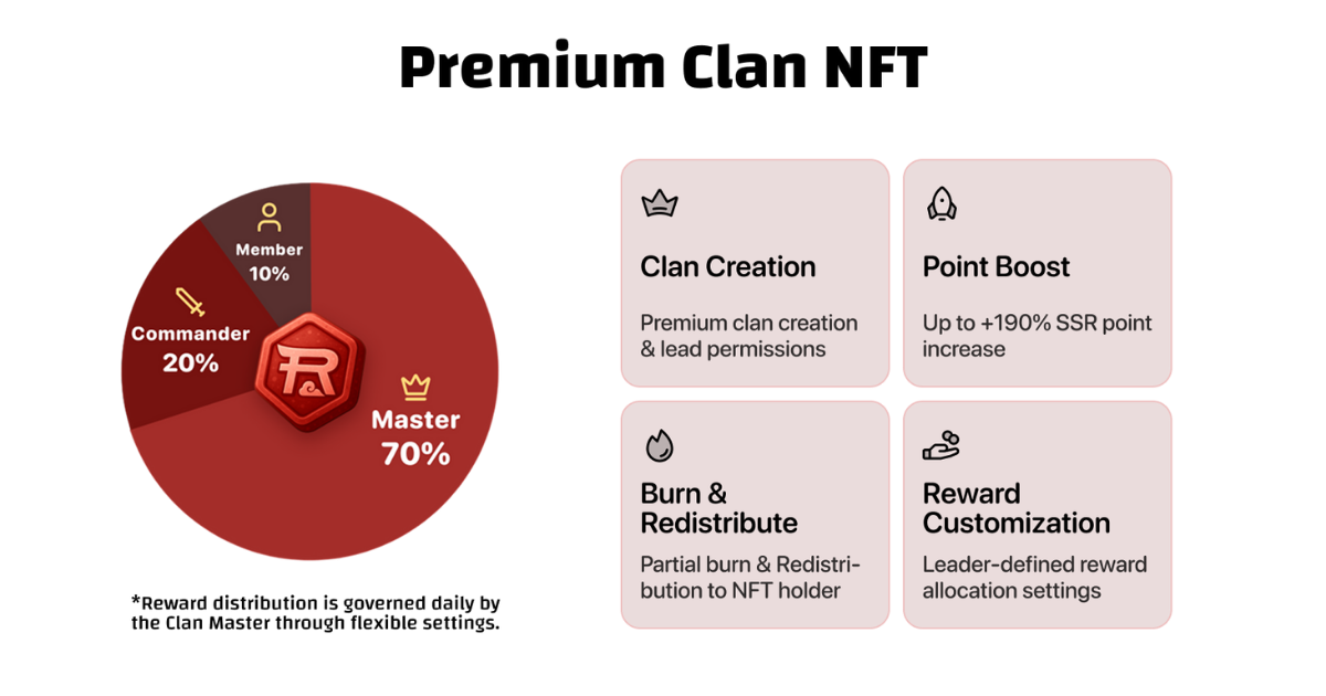 They are backed by the **Closed-Loop Token standard** on the **Sui blockchain**, allowing precise control over token flow. This means that only Premium Clan members can earn or spend specific NFTs and points, and all asset movements—including conversion, burning, and redistribution—can be tailored to the clan’s internal rules. A portion of SSR points is burned during clan activities, and a set percentage of the burned points is **automatically redistributed to the Premium Clan NFT holder**, encouraging long-term engagement.