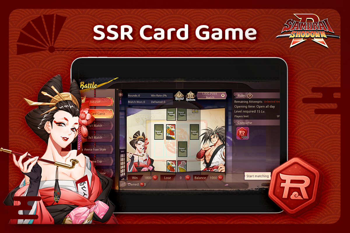 So why not step away from the tension of the battlefield today and take on a quiet battle of wits on the cards? From your fingertips, strategy and intuition will once again turn into real SSR-point assets. In Samurai Shodown R, every decision and move you make carries value.
