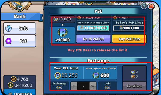 ### ☝<mark style="color:blue;">**Within the game interface**</mark>, click the "<mark style="color:blue;">**Bank**</mark>**"** building and go to the "<mark style="color:blue;">**P2E**</mark>**"** menu. This is where you can convert your P2E Points.